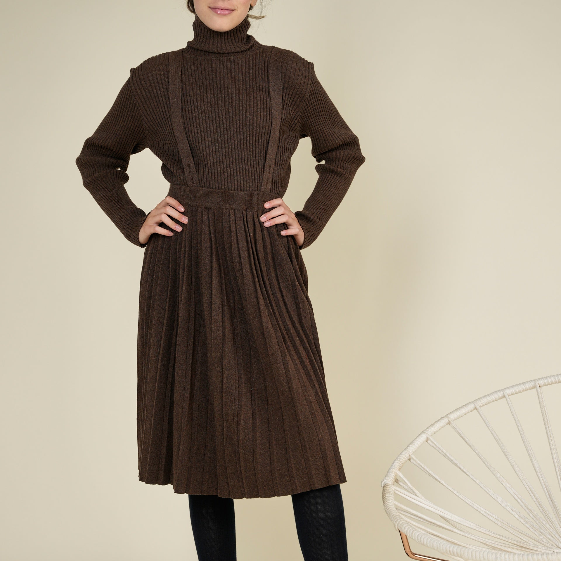 Perfect for any occasion, the Pleated Sweater Skirt With Suspenders is bringing both charm and comfort to her outfit.
