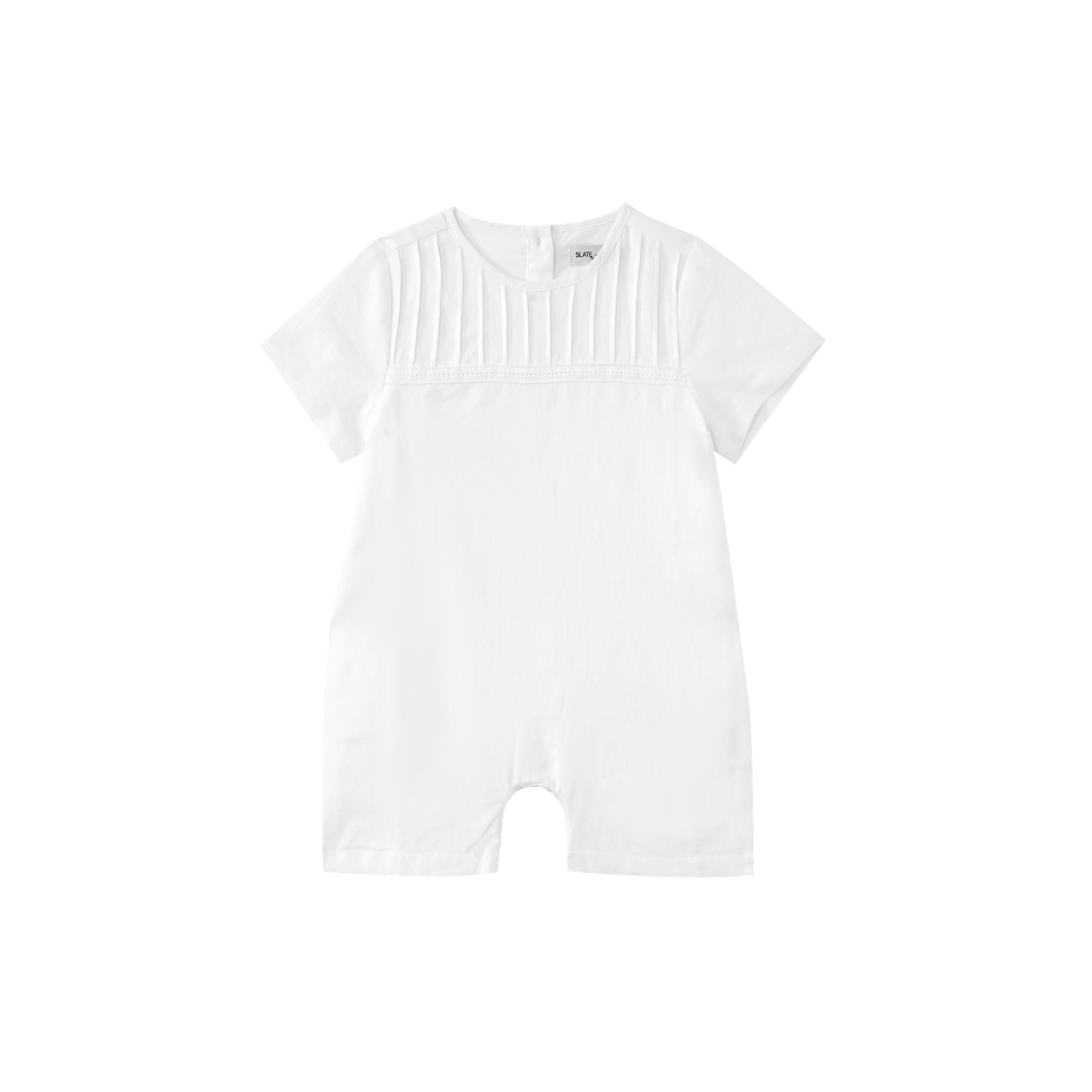 Heirloom details. The Romper with Tucks features delicate tuck detailing on the bodice, offering a vintage aesthetic. It's a beautiful choice for a bris or a special family gathering.